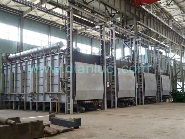 臺車式燃氣爐采用臺車式結構,需處理的工件擺放在臺車上,裝好工件后的臺車由臺車的牽引電機驅動進入爐內,進行加熱,臺車與爐體之間間隙通過密封槽和保溫棉密封,以避免熱量外溢。設備在工作中,裝在爐膛兩側的電阻帶、爐門、后墻和爐底的電阻絲將散發的熱量通過輻射對工件進行加熱,以保證爐溫均勻性。打開爐門,臺車開出爐外,由人工將處理好的工件卸下,再裝上新工件進行下一爐。